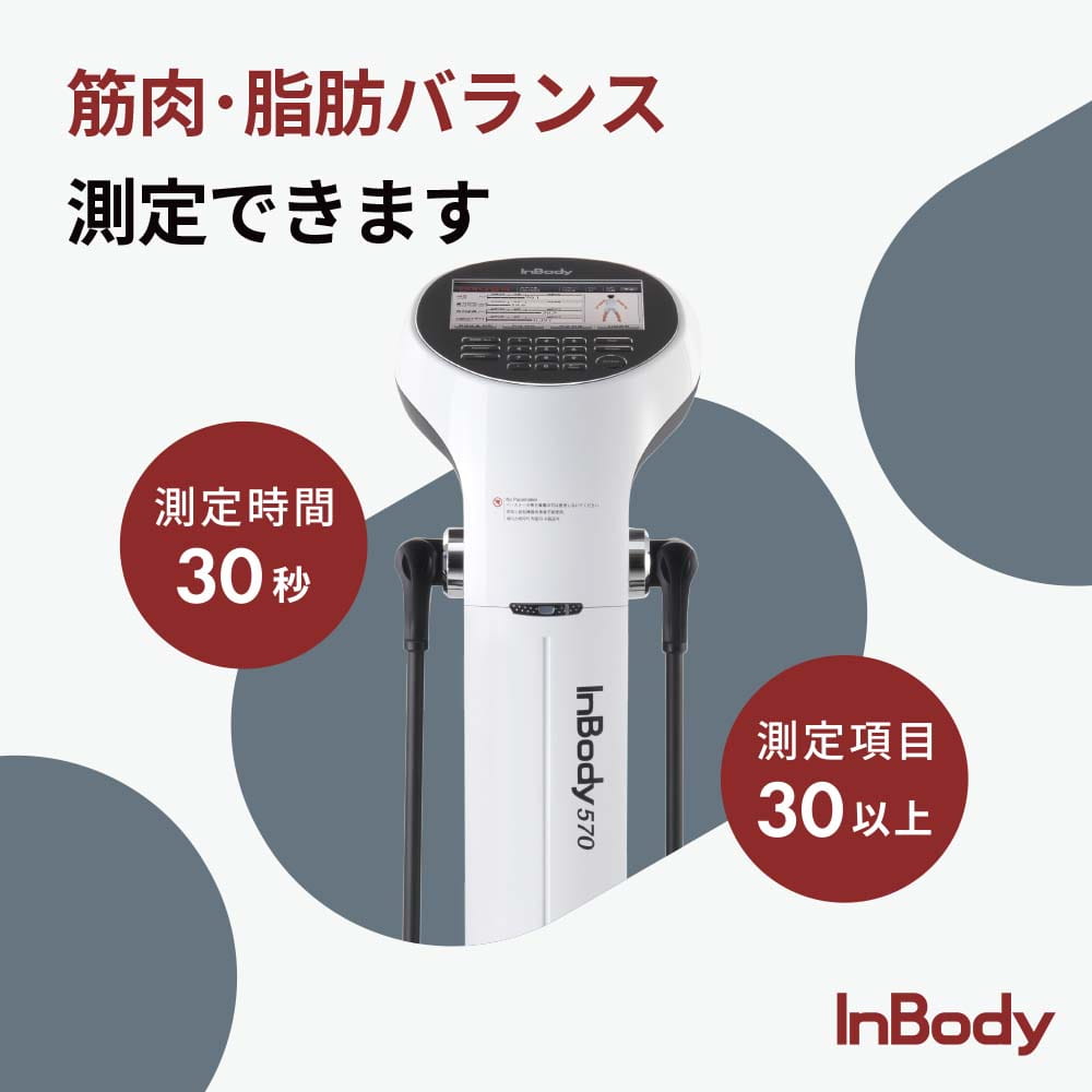 In Bodyという精密体組成計器を用いて、筋肉量や骨量、体水分量、基礎代謝量等身体を構成する成分(体組成)を分析し、身体の筋バランスや成分の過不足が確認できる測定です。